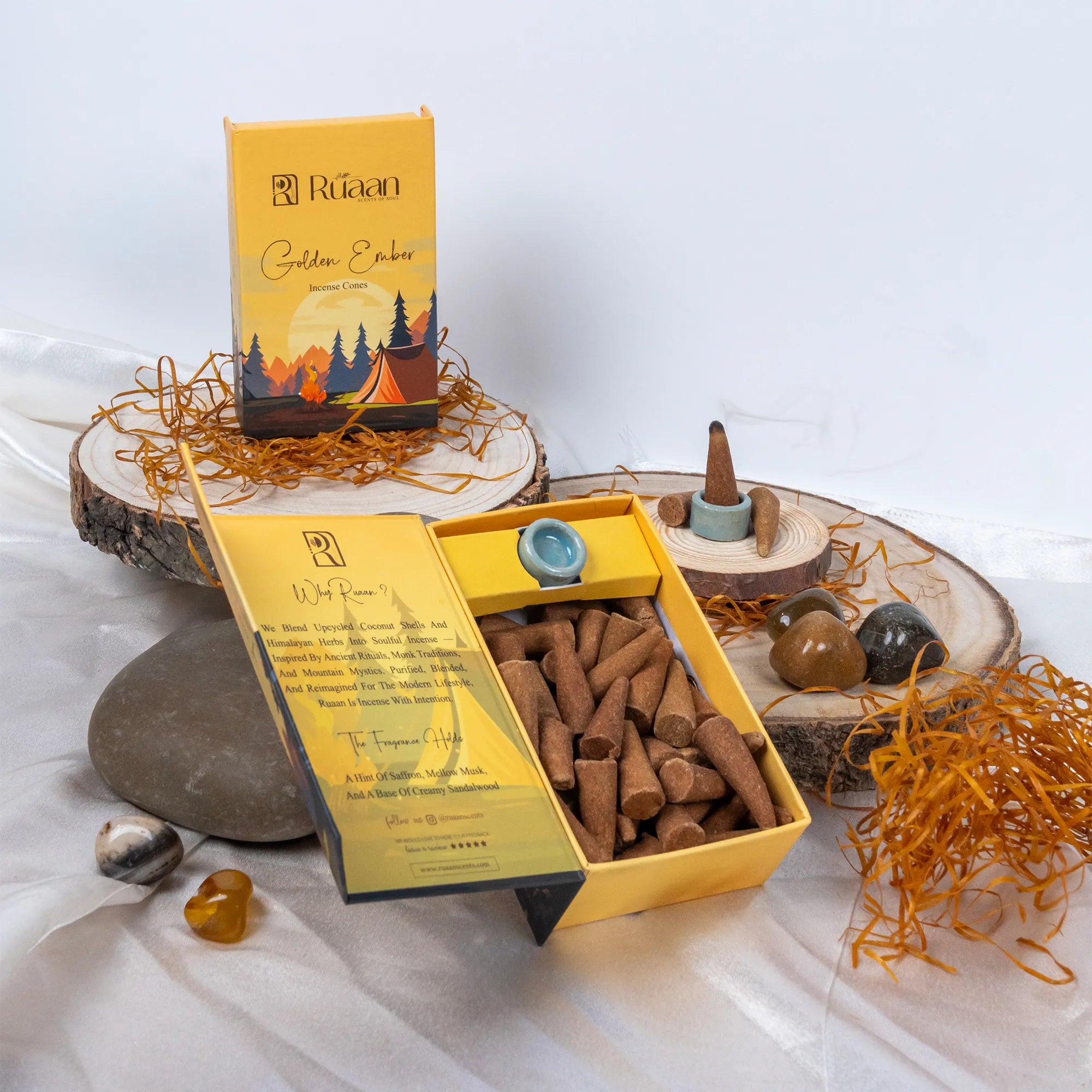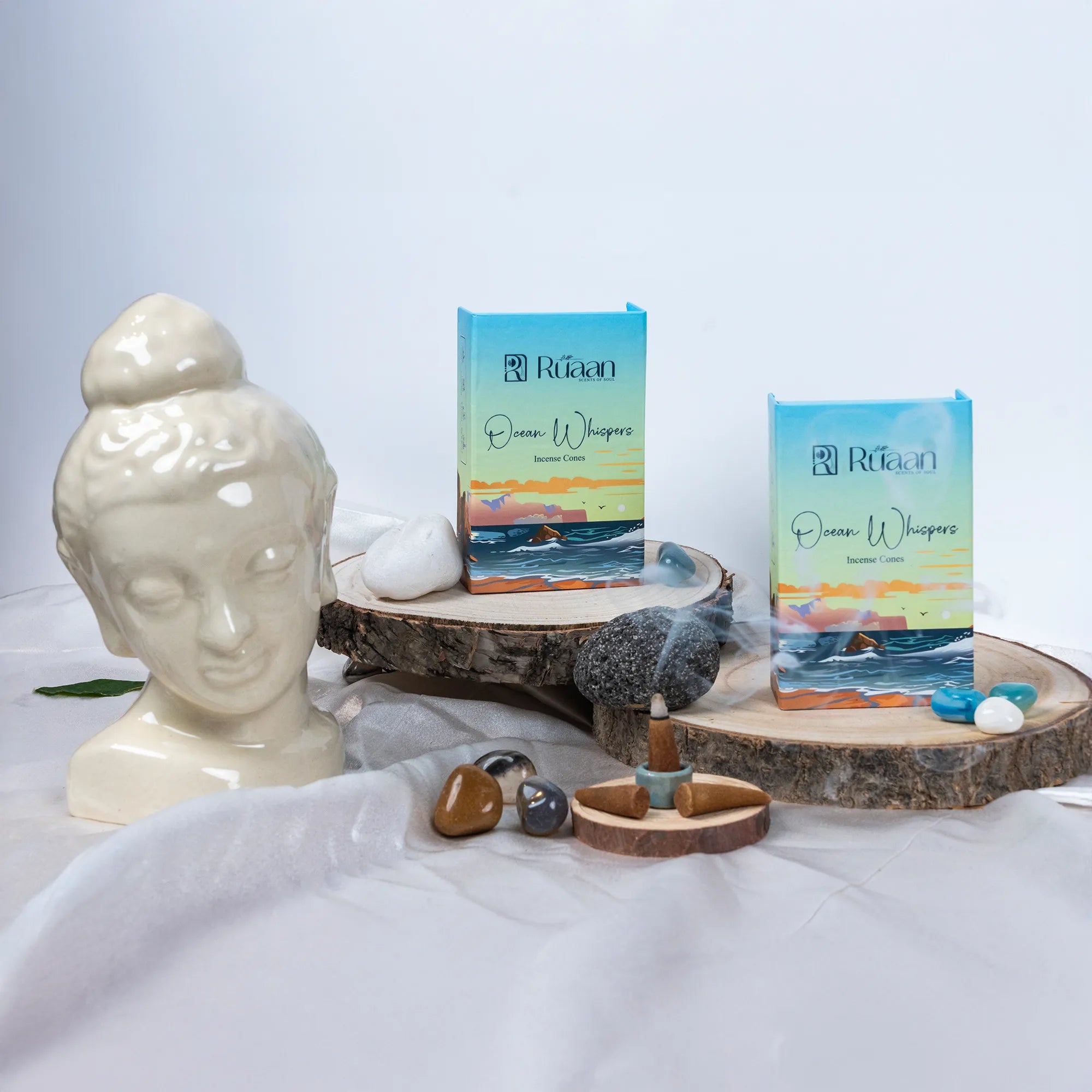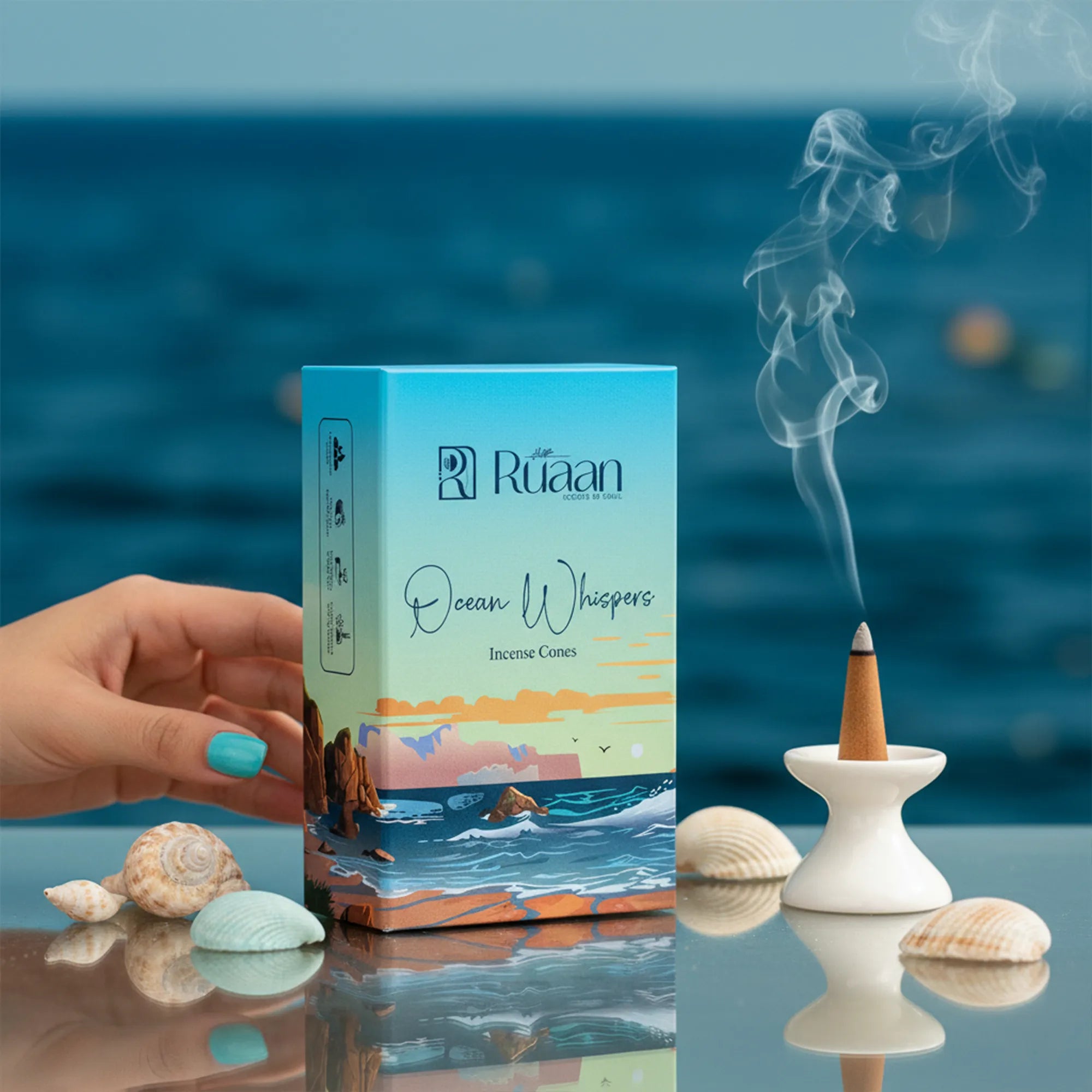 Elevate your space with Ruaan’s Golden Ember & Ocean Whispers Premium Incense Cones Combo.