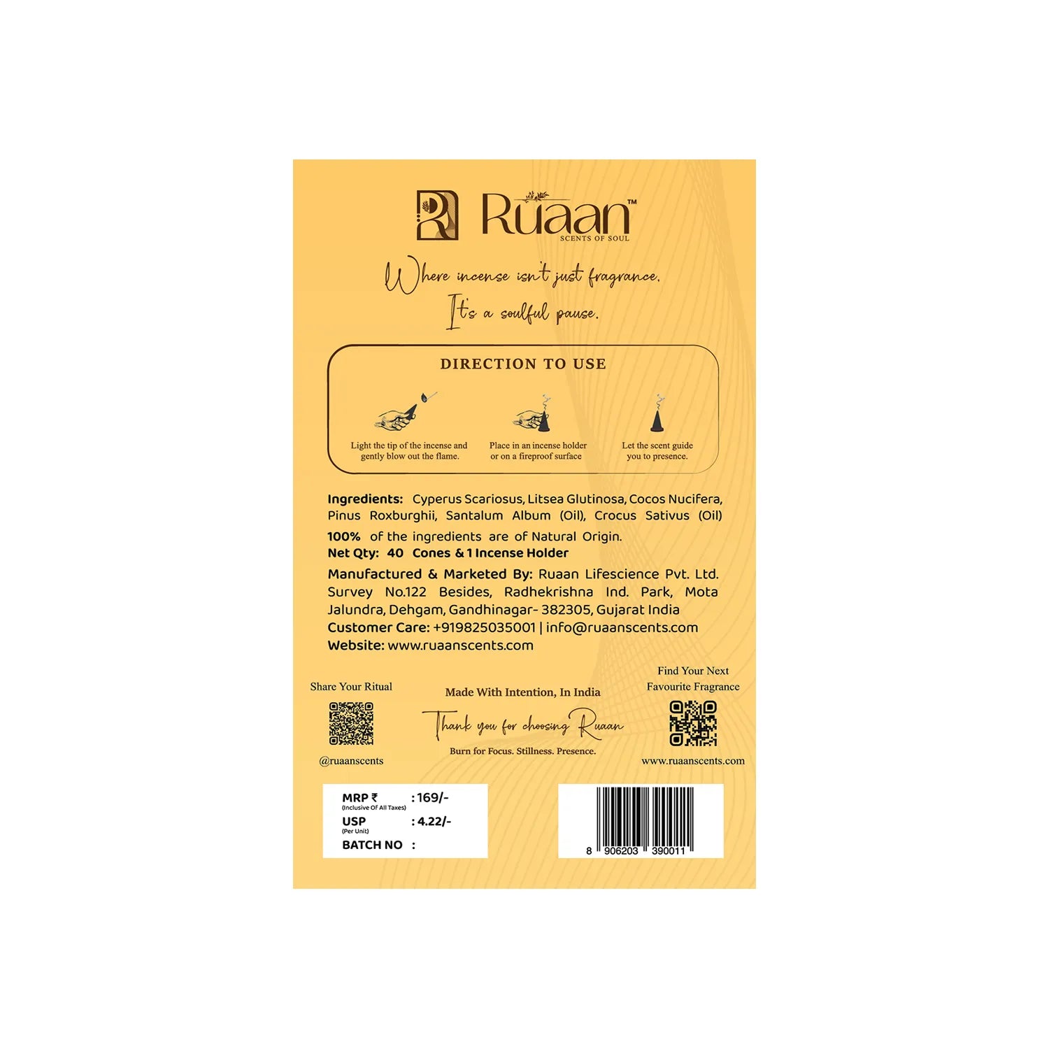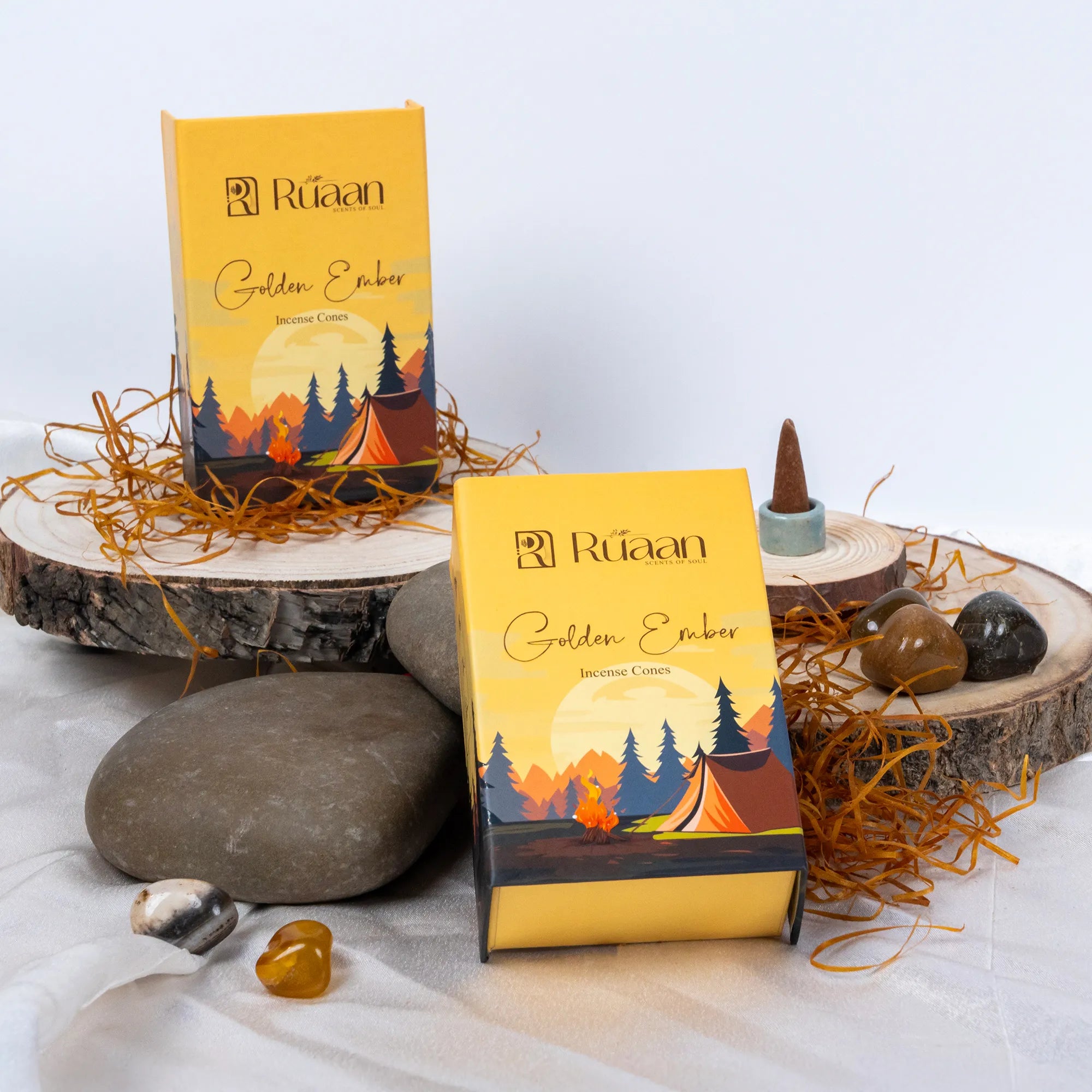 Immerse yourself in the luxurious aroma of Ruaan’s Secret Petals & Golden Ember Premium Incense Cones Combo.
