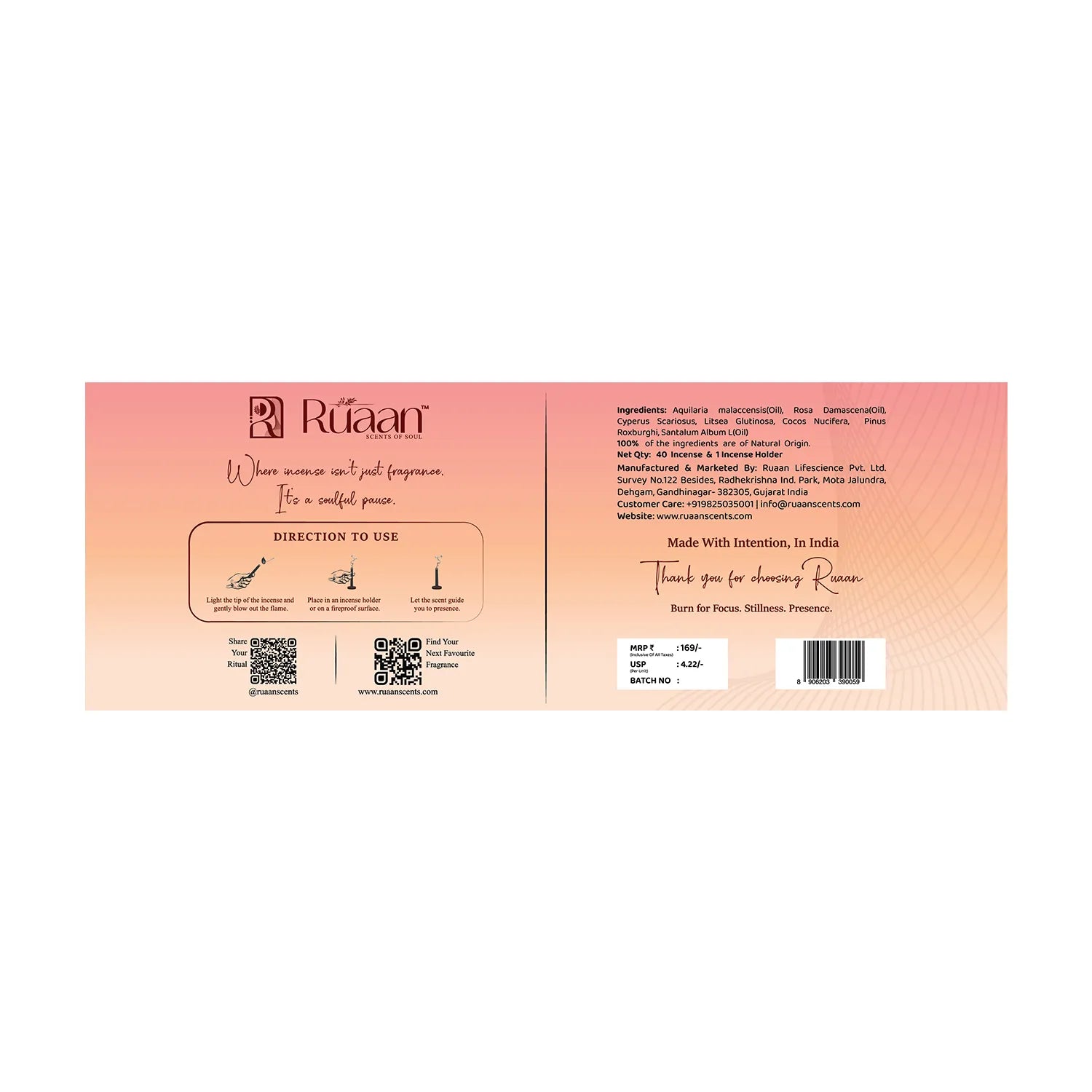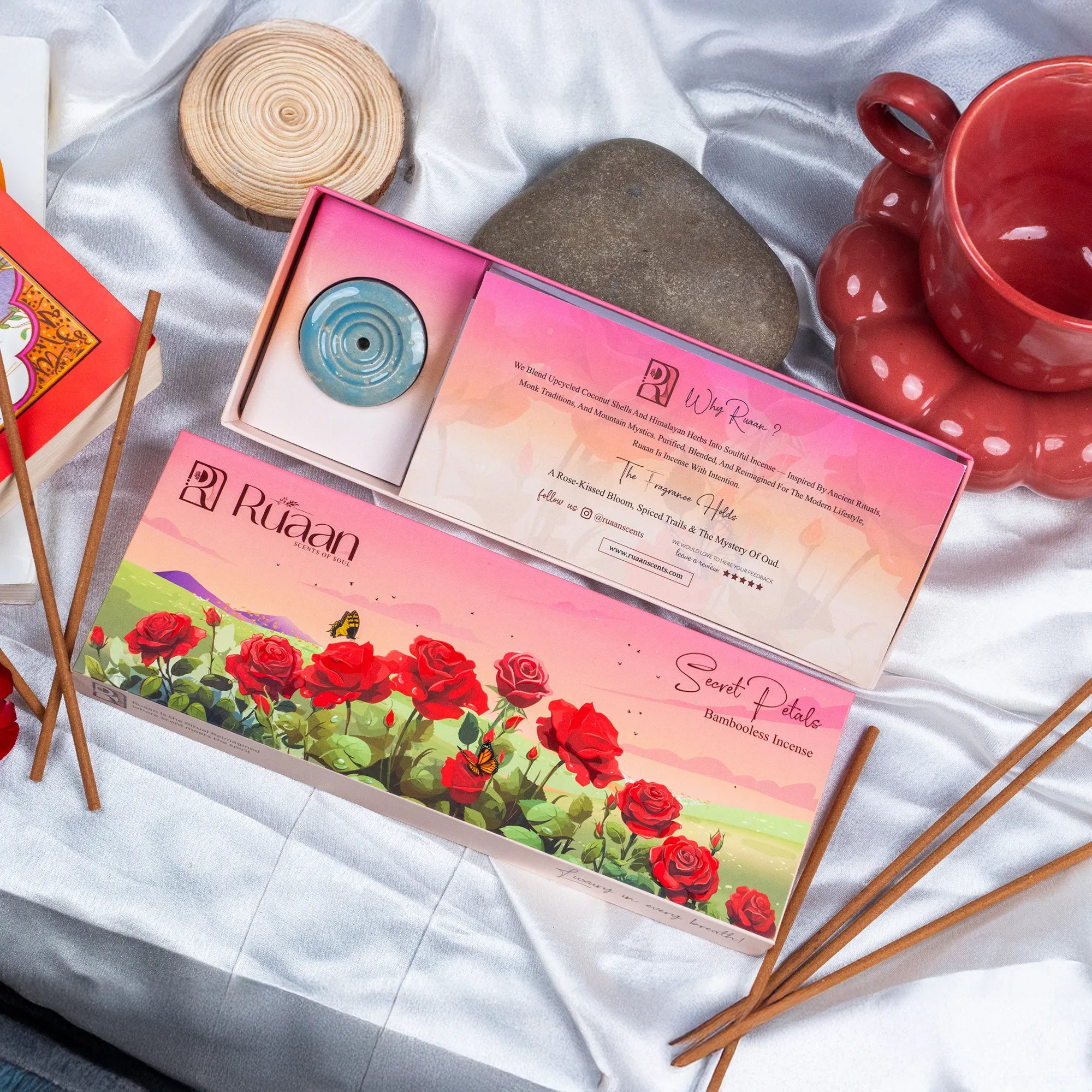 Embrace peace and warmth with Ruaan’s Secret Petals & Golden Ember Premium Incense Sticks Combo.